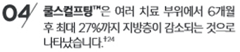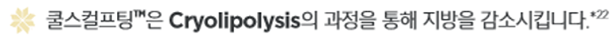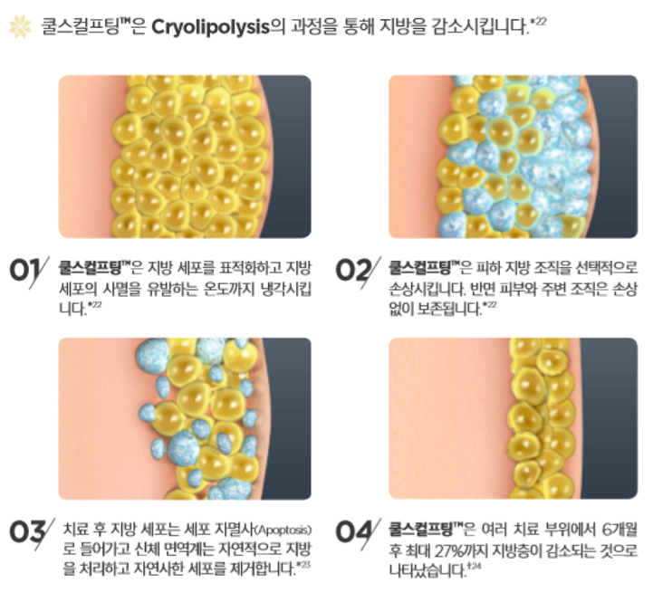 쿨스컬프팅은 비침습적인 방법으로 피하지방층을 줄이는 시술입니다. 제어된 냉기를 이용하여 운동만으로는 잘 빠지지 않는 피하지방세포를 제거해 줍니다. 냉동된 지방세포는 시간이 지남에 따라 사멸되고, 체내에서 자연적으로 대사 후 제거됩니다. 쿨스컬프팅 시술 후 6개월 이내에 27% 정도의 지방을 제거할 수 있습니다.