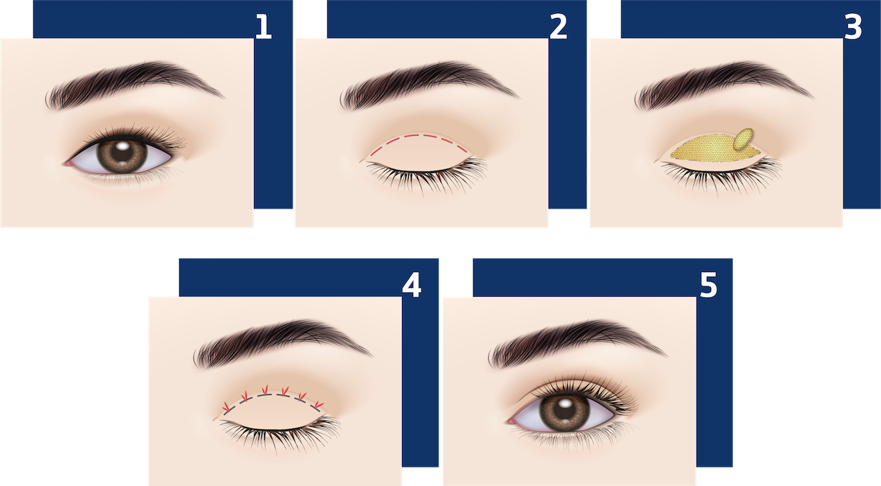 - 눈꺼풀 피부와 눈을 뜰때 쓰이는 근육 사이에 유착을 만들어 쌍꺼풀 라인을 완성합니다.